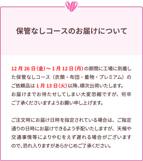 保管付きコースなら注文後、キットが届いてから好きなタイミングで利用できるので衣替えが終わってから集荷に来てもらっています。 最長9ヶ月保管してもらえるので、次のシーズンまでクローゼットがスッキリ片付くのがいいですね。